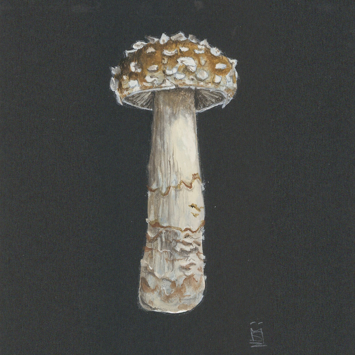The Fly Agaric toadstool is a distinctive large white gilled toadstool featuring a bright red cap covered with white warts This image portrays a young emerging toadstool taken from an original painting done in gouache on mount board.